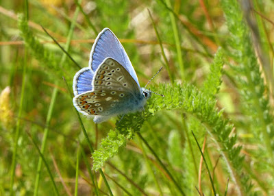 61.018 Common Blue male at Copley meadow, June 3rd 2018. This site holds a very small and endangered colony due to disturbance by dog walkers and the tipping of canal dredgings.